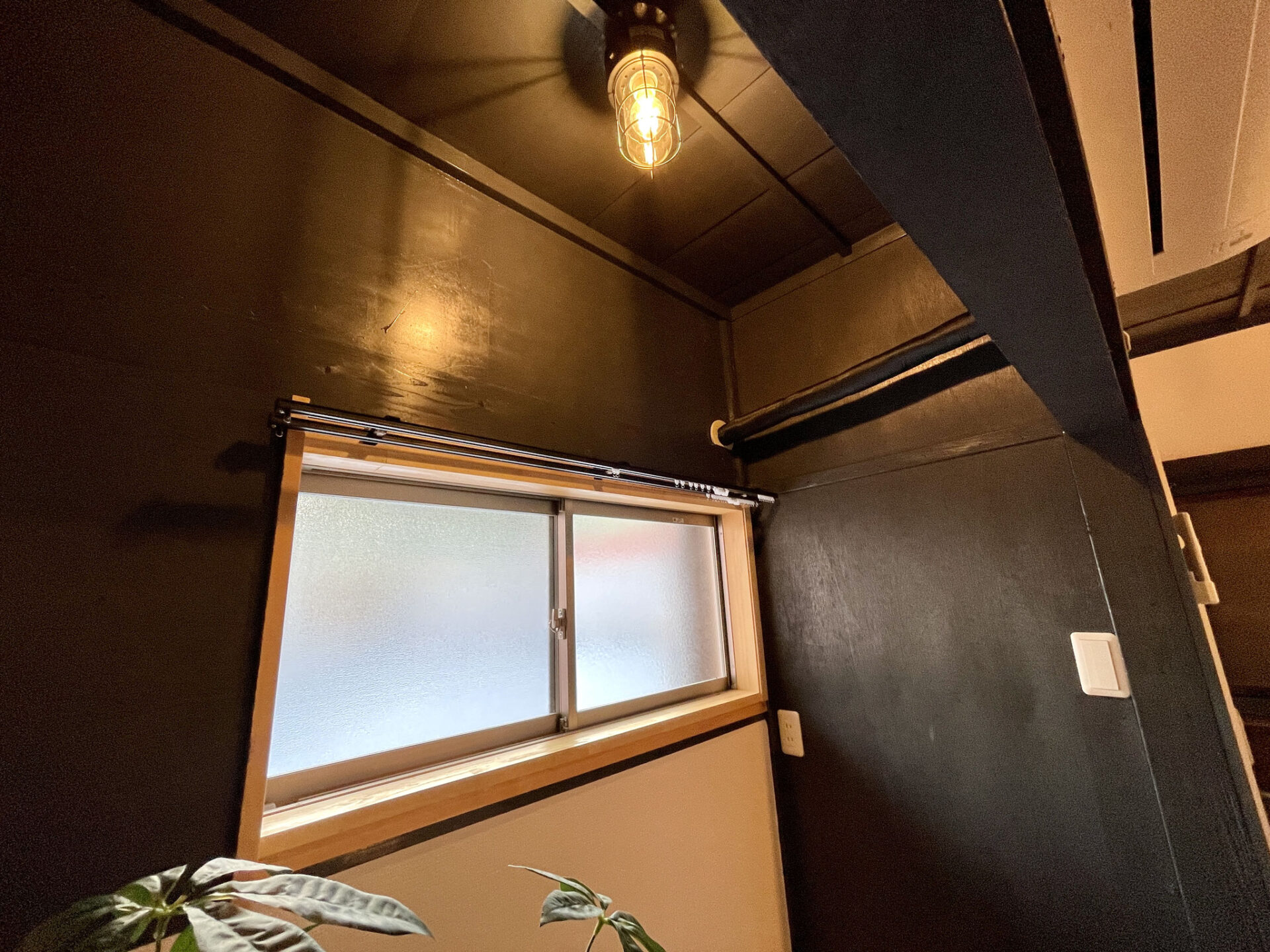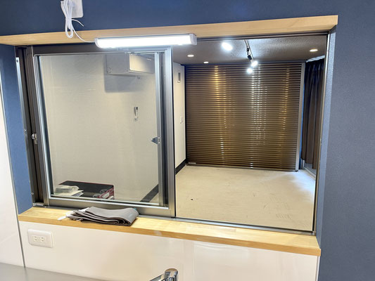 居住スペースからもガレージ内を見れる小さな窓が。