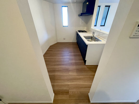 5.6帖の広さがある対面キッチンは壁でほどよく囲まれていて、まるで個室のような落ち着いた空間。