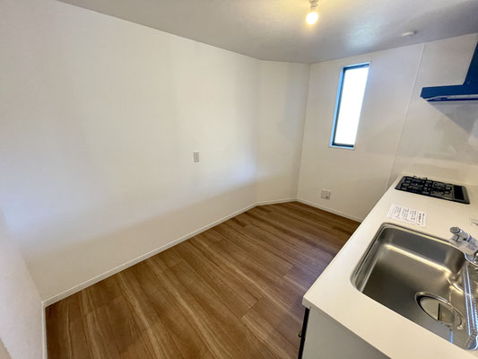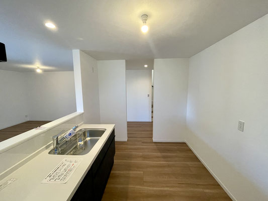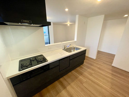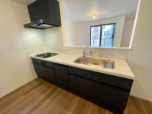 キッチンからはリビング全体が見渡せる、開放感たっぷりのレイアウト。正面には大きな窓があり、料理をしながら自然光を感じられる、気持ちのいい眺めが広がります。家族の様子を見守りながら作業できるので、子育て中の方にもぴったりな設計です。