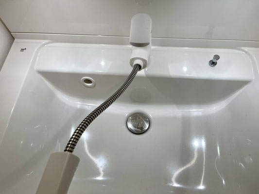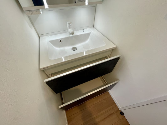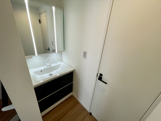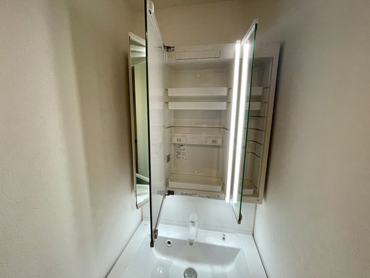 収納たっぷりのキャビネットに、伸びるノズルのシャワー水栓、そしてライト付きのミラーが備わっています。
