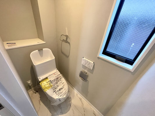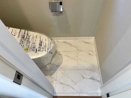 洗面所の奥のトイレには、ホワイト系の壁紙と大理石調タイルの床を採用。