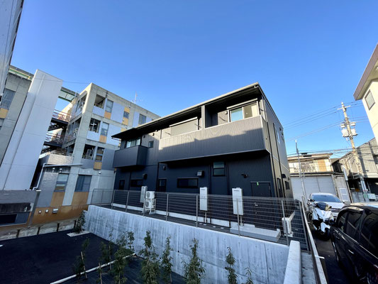 建物外観は黒を基調として木目調をアクセントにしているセンスの光る外観。