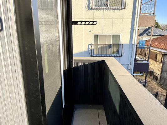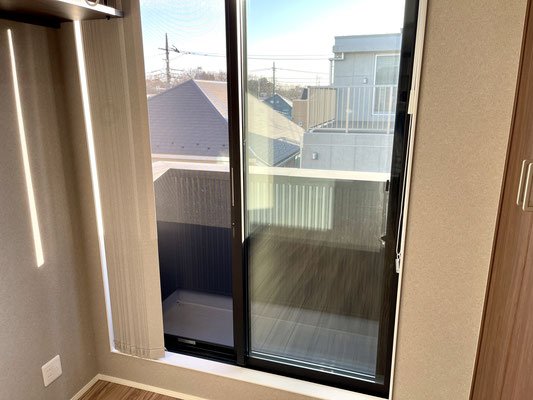 お部屋の端にはベランダがあり、窓にはバーチカルブラインドカーテンも付いています♪