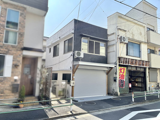 建物外観は外壁のリペイントや新品ピカピカのシャッターが目を引くかわいいキューブ型の一軒家。