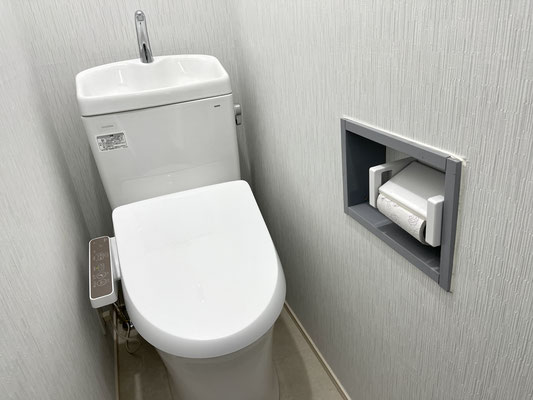トイレットペーパーホルダーを壁の中にオフセットしているのが優しさですね〜