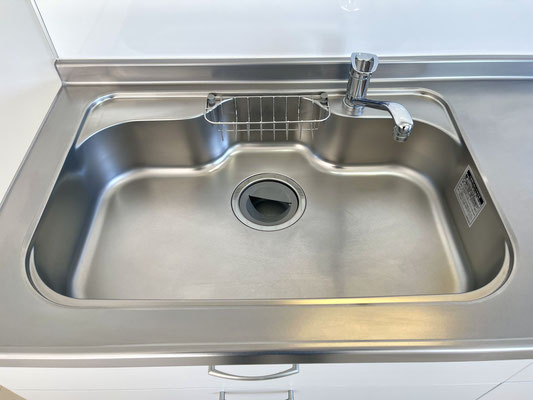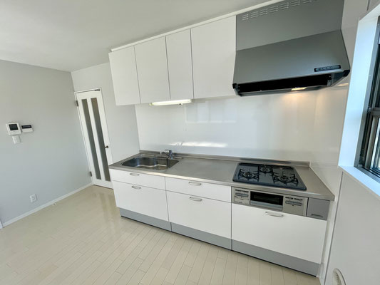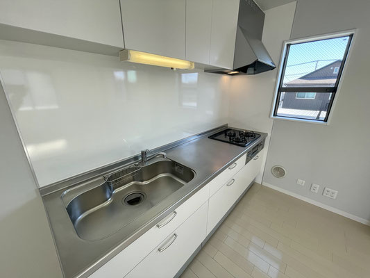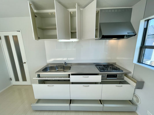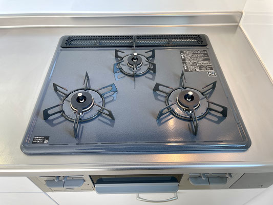 ホワイトを基調とした大型キッチンは、広いシンクに3口のガスコンロが付いています。