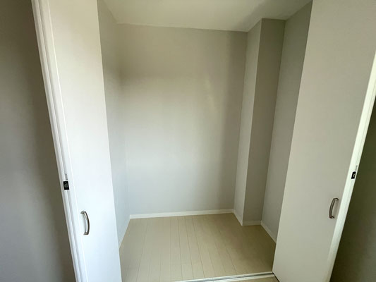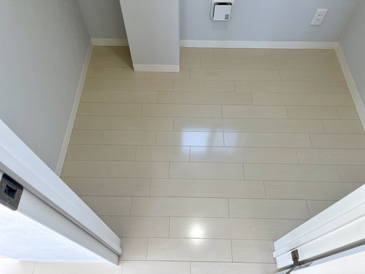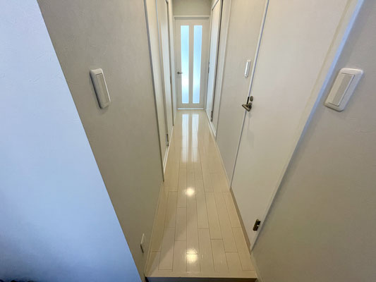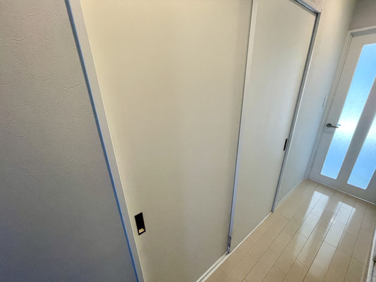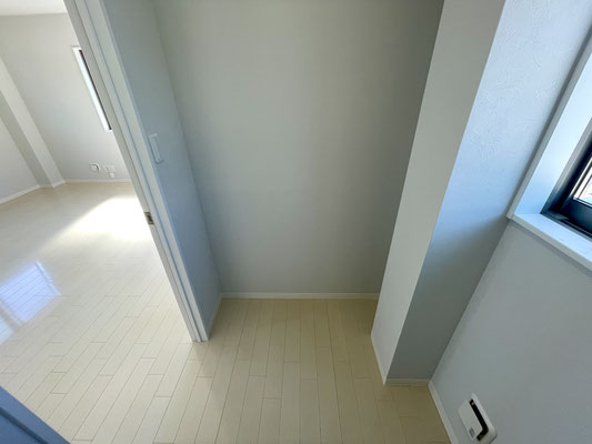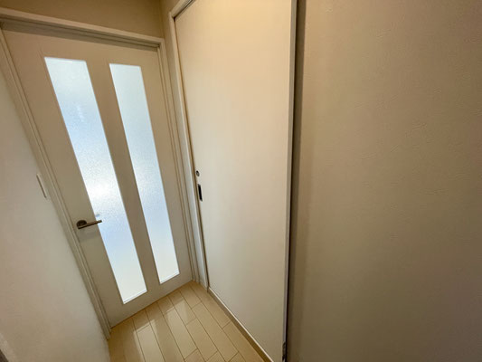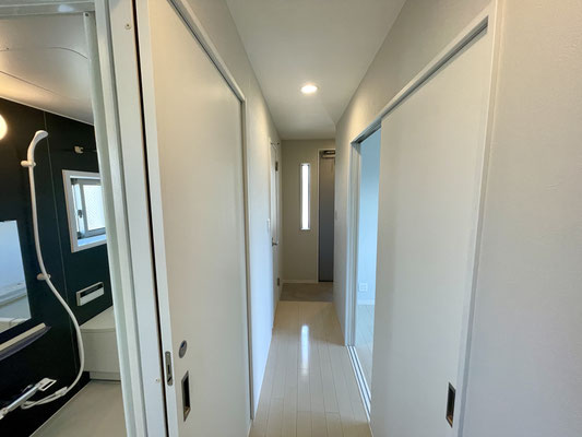 廊下の奥の右手のスライドドアを開けると水まわりスペースがあります。