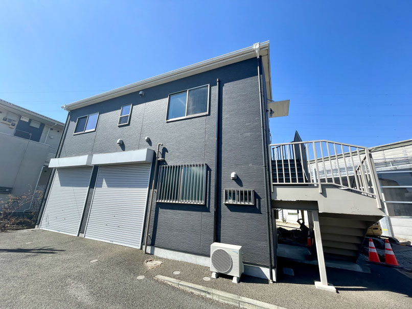 グレーの外壁にホワイト系のシャッターが2つ並んだ、スッキリとした印象の外観。