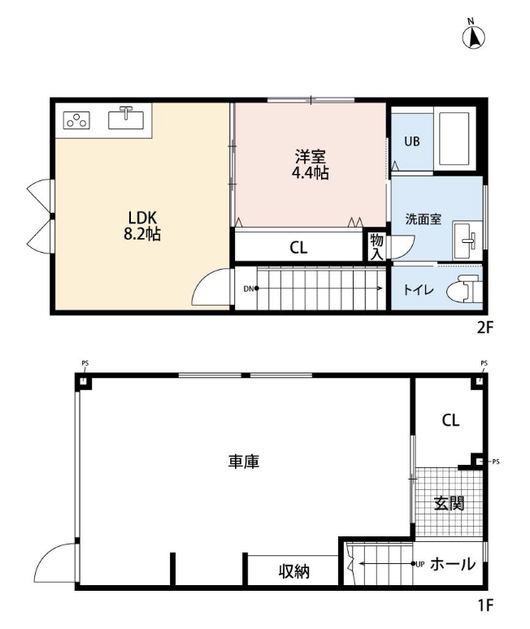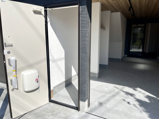 入るとすぐガレージ内で同じ空間ですがキチンと玄関ドアがあるのは有り難い〜