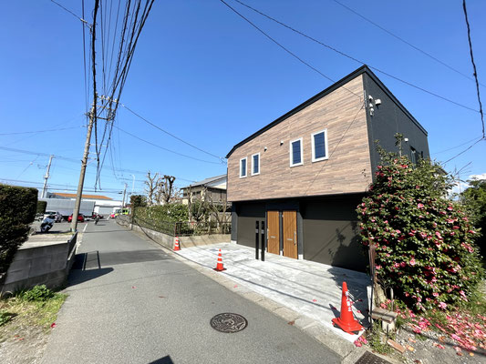 建物外観はブラックとウッド調のサイディングで変形片流れ屋根が特長的な2戸物件。