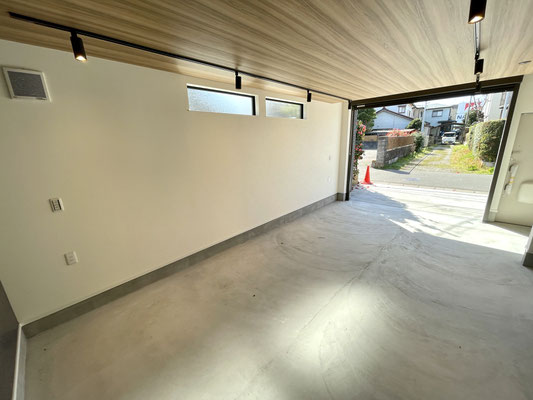 奥行きがあるガレージはウッド調の天井と奥のアクセントクロスが特徴的な居心地の良い空間。