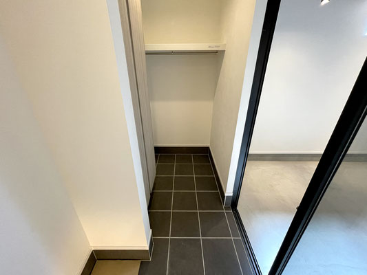 下駄箱収納も大型で大容量だし、その奥にもハンガーラック付きの収納。