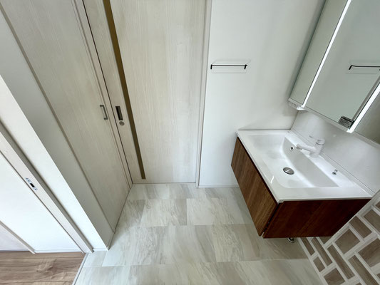 オシャレな壁はウッドタイル調で上部にはFIX窓もあり、明るい雰囲気の脱衣所〜