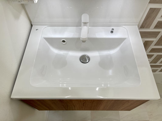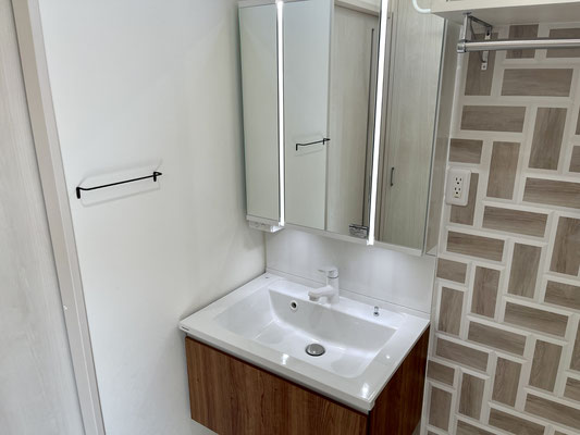 女優ライト付きの洗面台は鏡の裏も収納スペース。