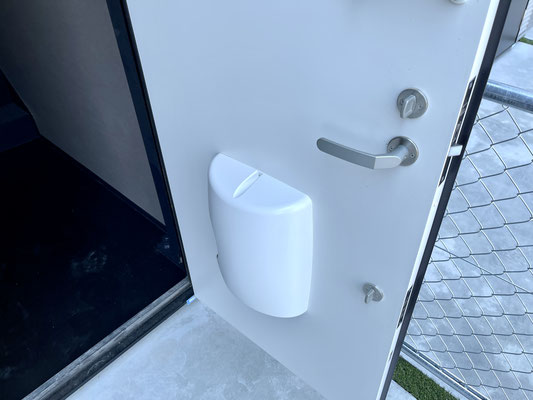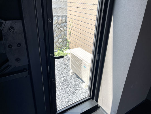ガレージ奥の扉を開けると建物の裏手に出れます。