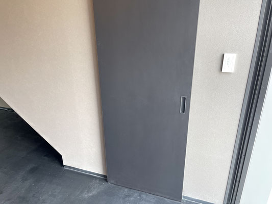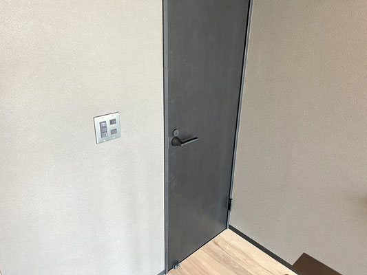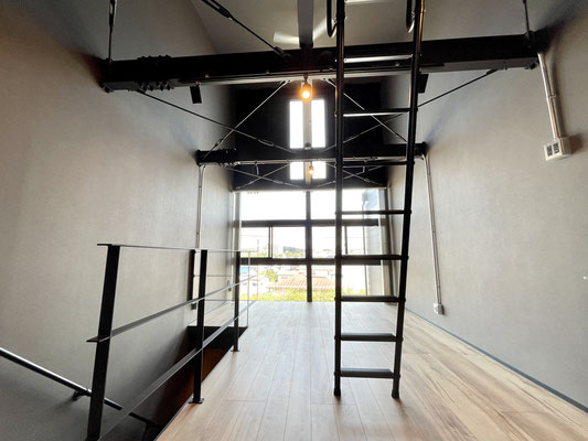1階のガレージ同様ブラックの鉄骨とグレーの壁紙クロスがおしゃれなお部屋です。
