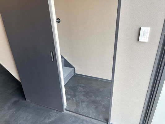 玄関ドアを開けると左手にはガレージに通じるスライドドア、正面には2階に上がれる階段があります。