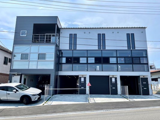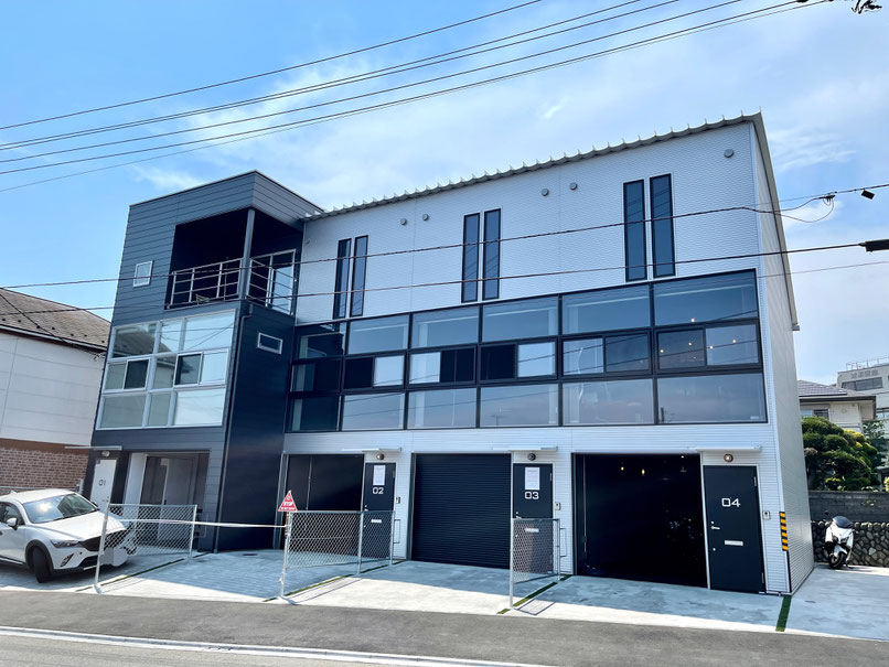 1階のシャッターと2階の大きな窓が特徴的な建物。
