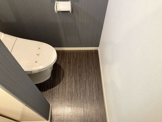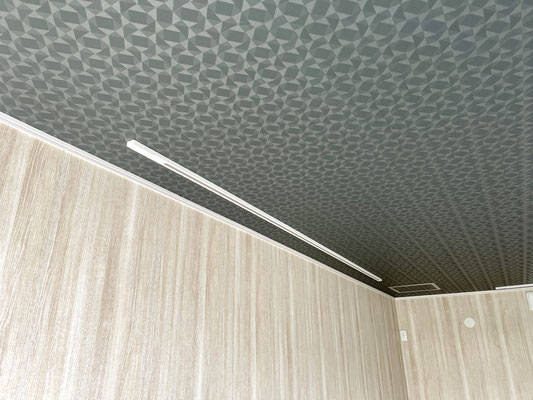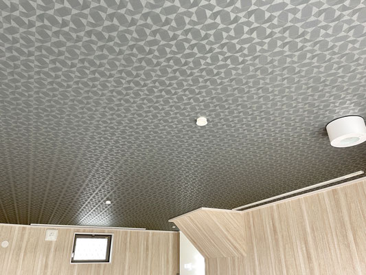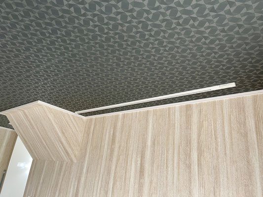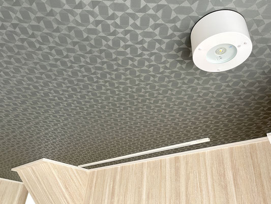 爽やかなウッド調の壁紙クロスとブラックの柄入り天井もオシャレ〜