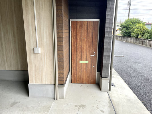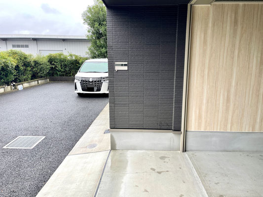 玄関ドアはガレージシャッターのすぐ近くにあります。