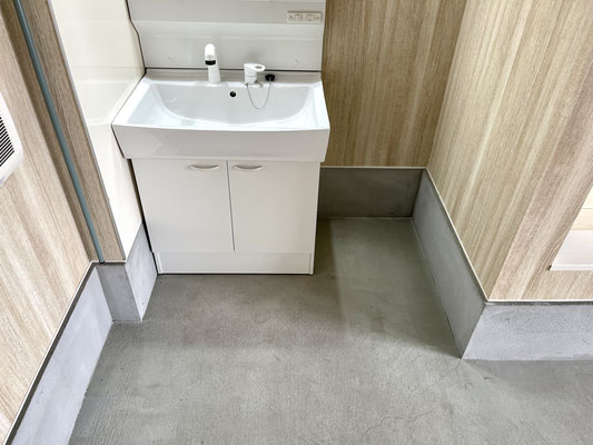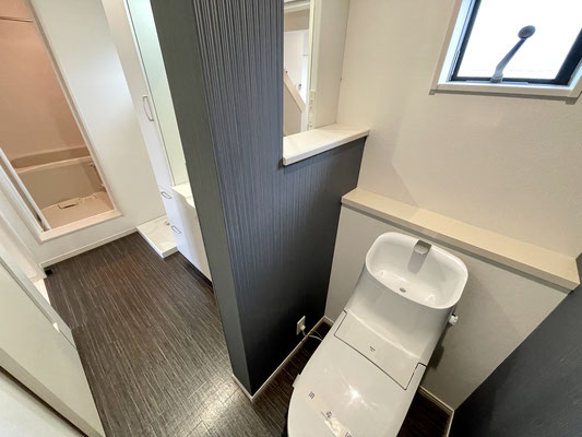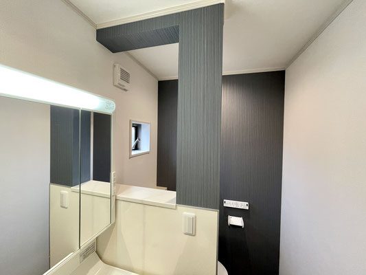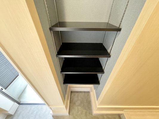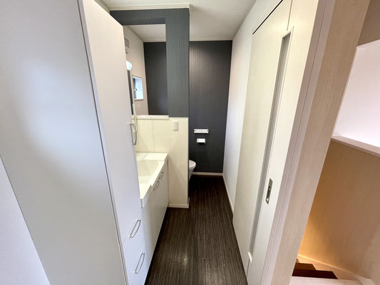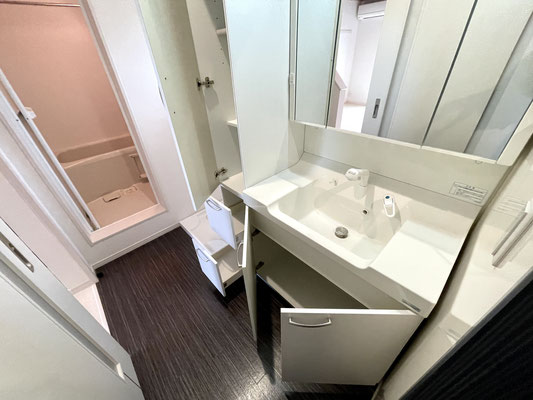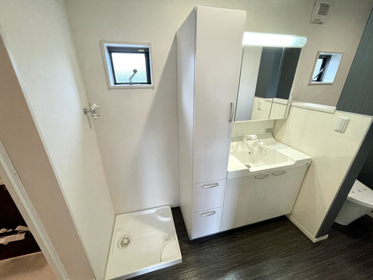 洗面台の隣にはタオルや洗剤などを入れておくのに丁度良い収納棚があります。