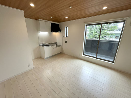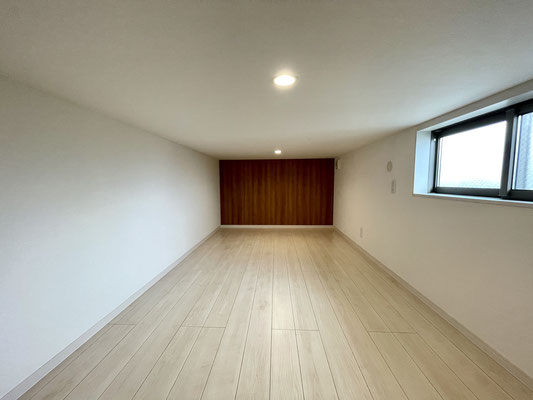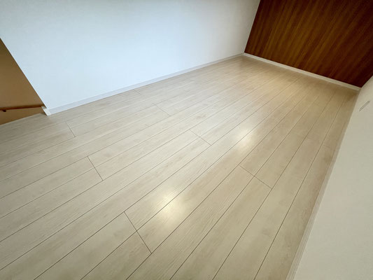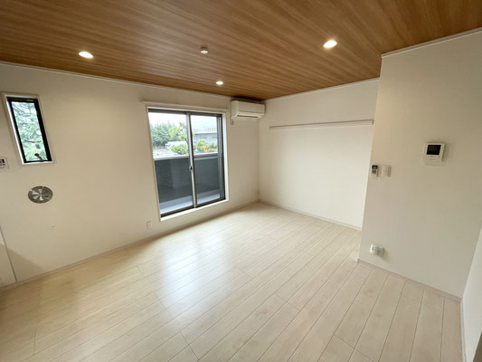広さは10.4帖で爽やかなフローリングともう少し濃い目のウッド調天井が特徴的なお部屋です。