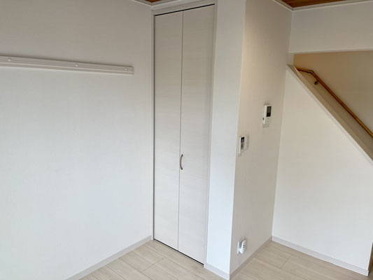 お部屋の中には扉付きの収納やハンガーラックもありますよ〜