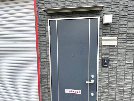 建物前面にはガレージ出入り口のシャッターと玄関ドアが並びます。