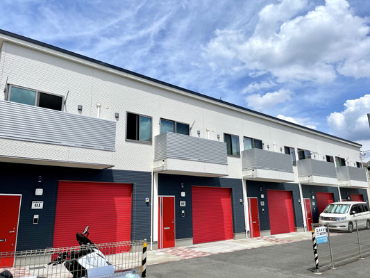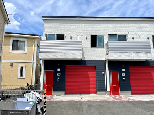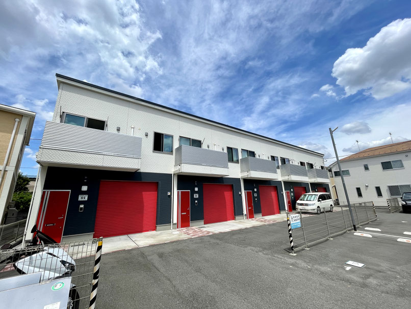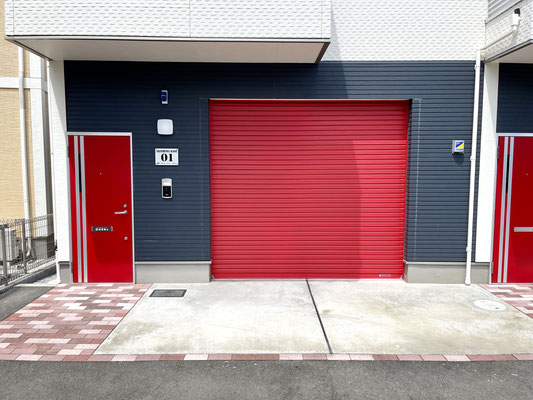 建物外観は真っ赤なガレージシャッターが目を引くガレージハウス。