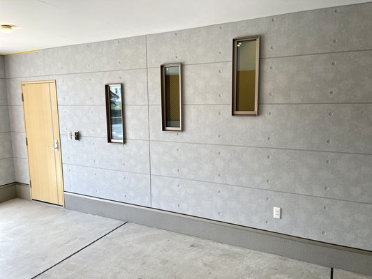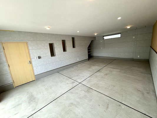 ガレージ内には居室に通じているドアや収納棚、換気が出来る窓、