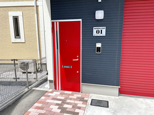 玄関ドアもガレージシャッターに負けないくらいの真っ赤です。