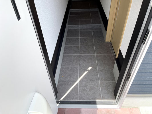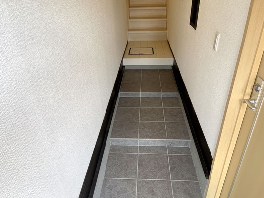 ドアを開けると長い三和土があり、その先に2階へと伸びる階段があります。