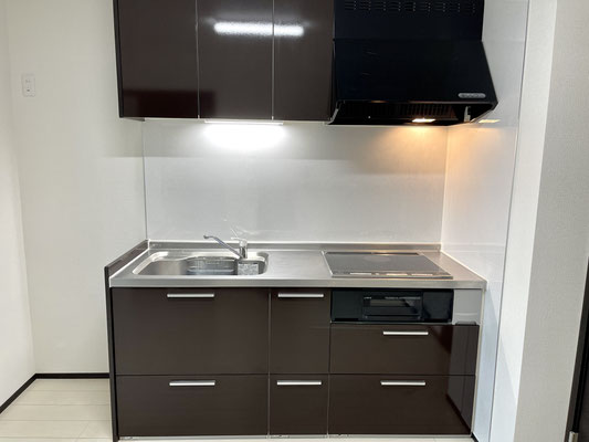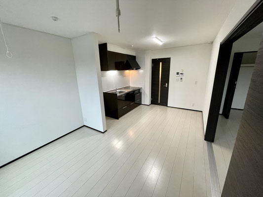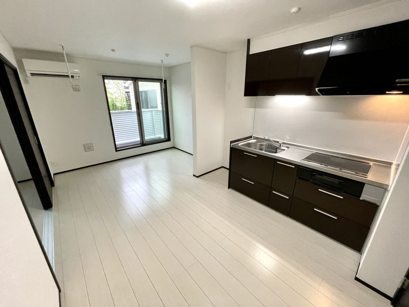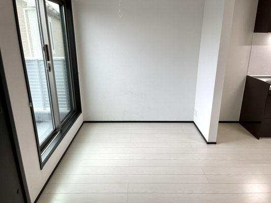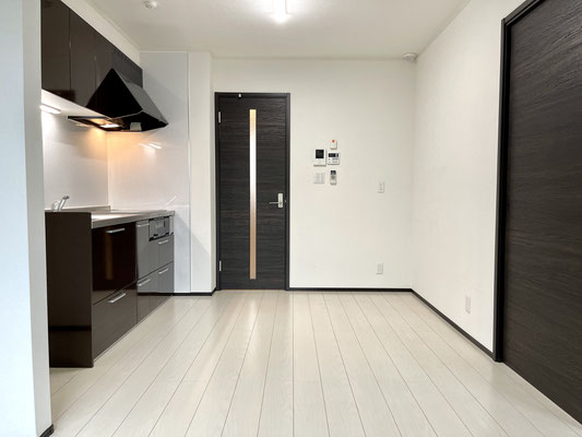 白いフローリング床とブラウンのキッチンがあるお部屋です♪
