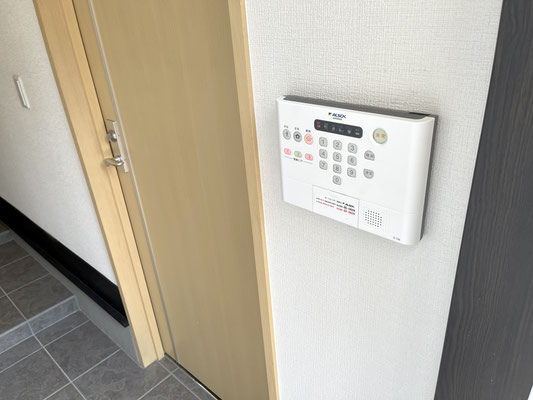 玄関ドアを開けた場所には操作端末があり、2階の居住スペースにも各種センサーが設置されています。