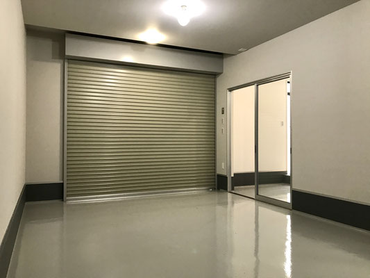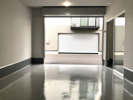 リモコン式の電動シャッターを開けるとそこにはピカピカのインナーガレージ!