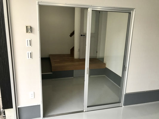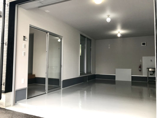 メインのガレージとの間にはガラスのスライドドアがあり空間分けも出来るこちらのサブガレージ!