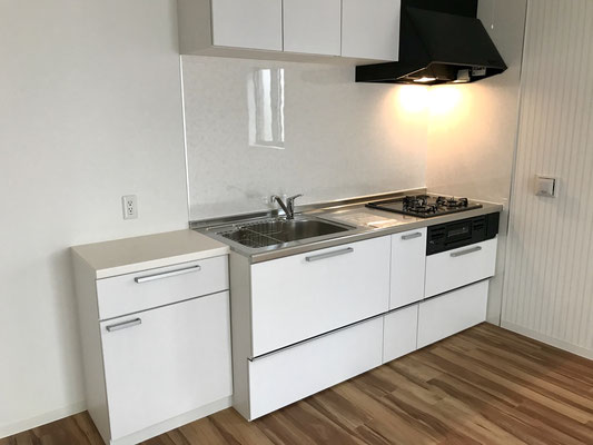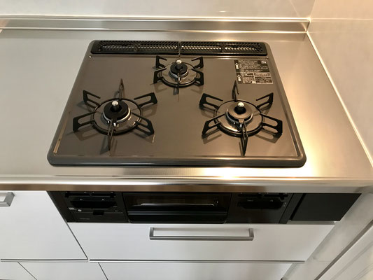 3口ガスコンロや電子レンジを置いても丁度良い収納台もあって使い勝手が良さそうです♪