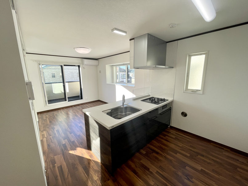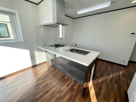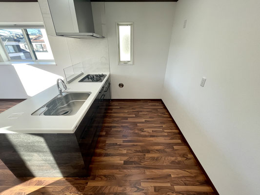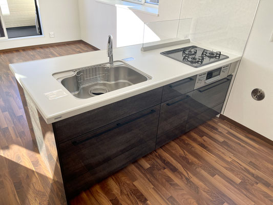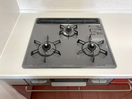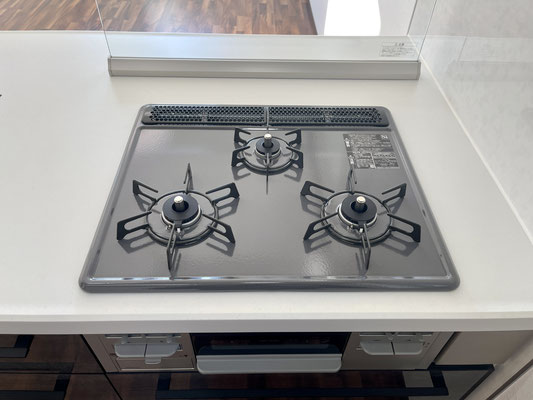 3口コンロやタッチレス水栓のシンクなどまるで分譲仕様のようなキッチンです。