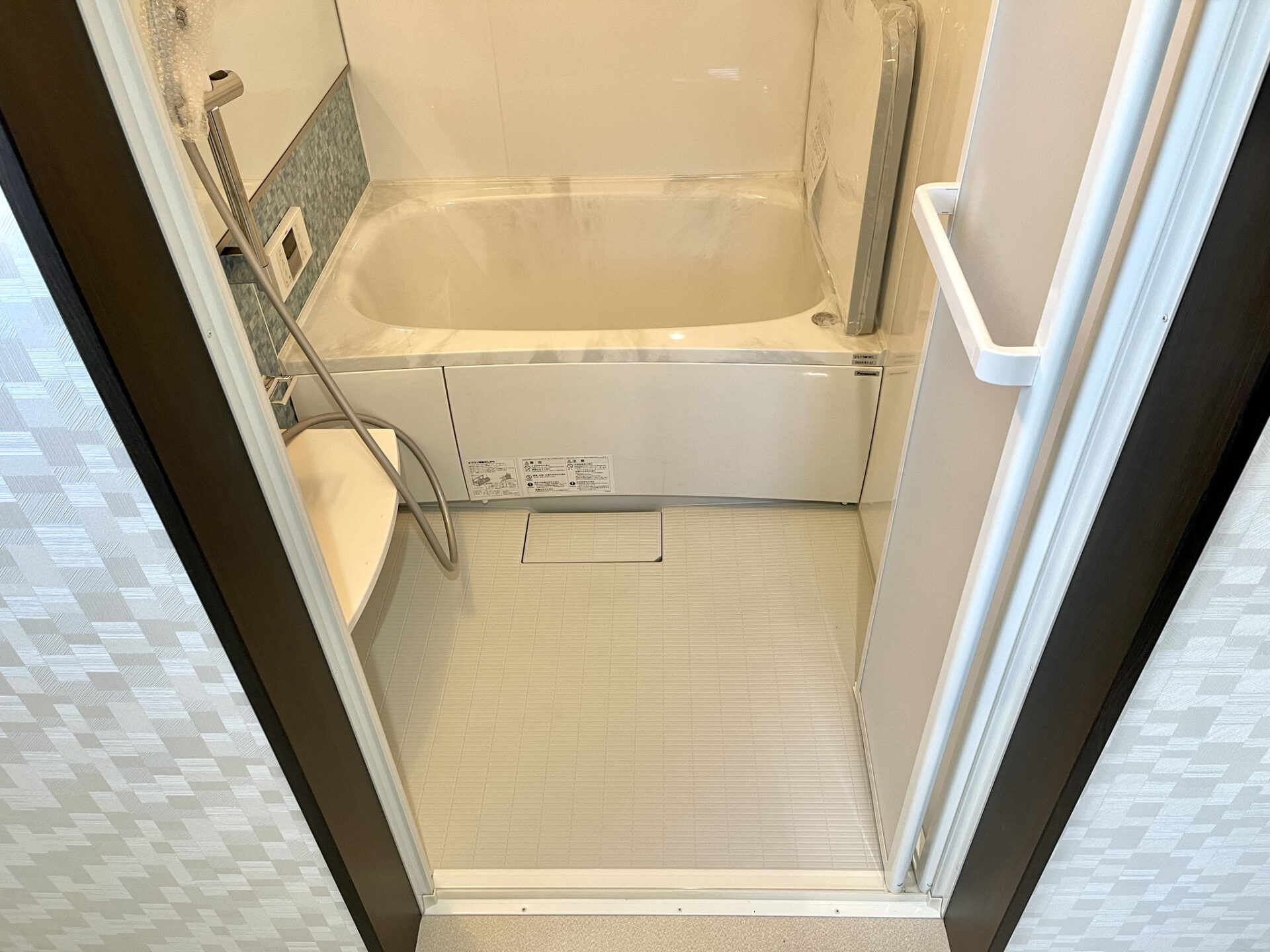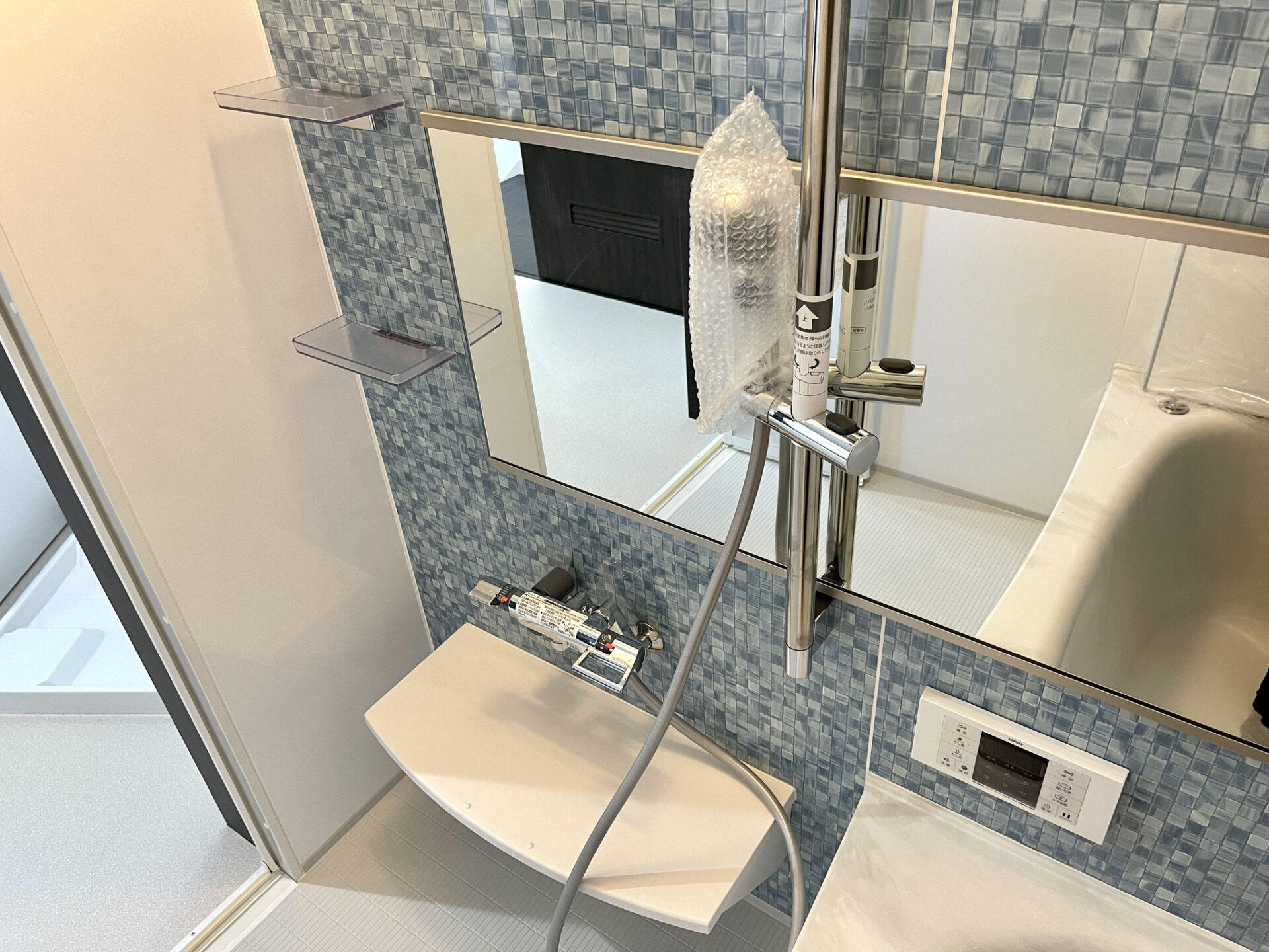 ブルー系のモザイクタイル調が爽やかなバスルームです。