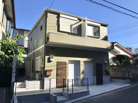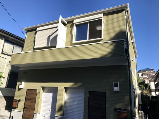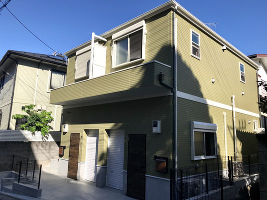 建物外観はモスグリーンの外壁が可愛らしい木造の2階建て。