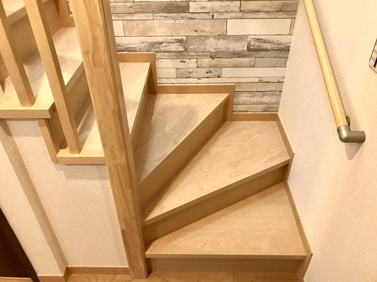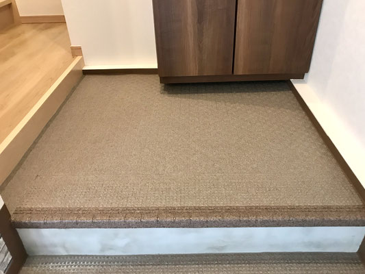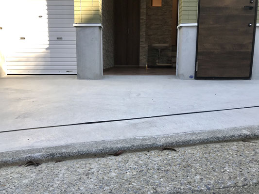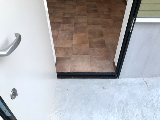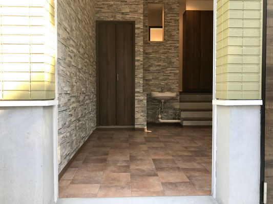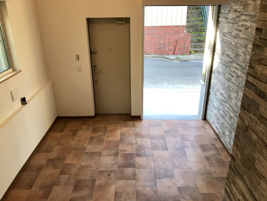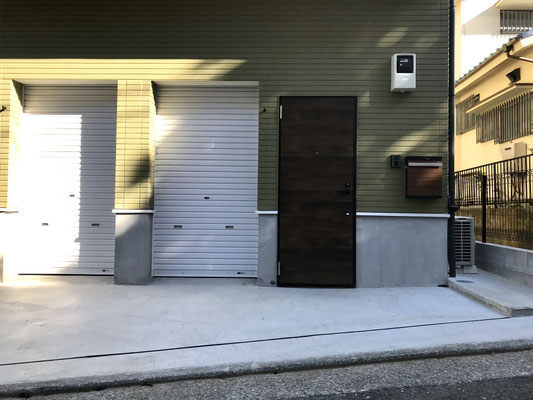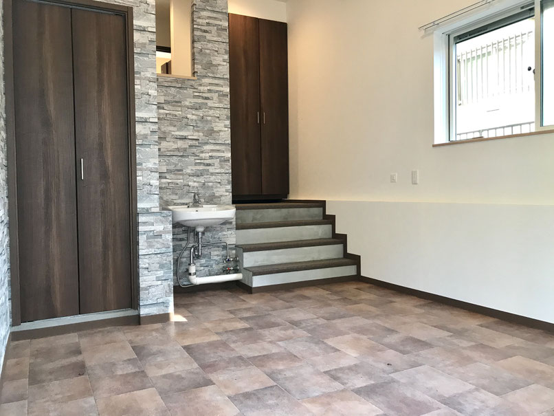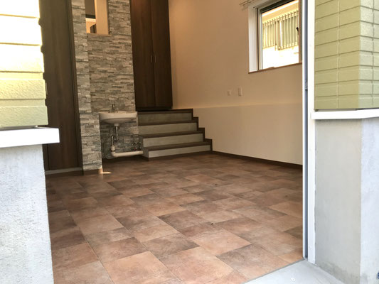 ガレージ奥の階段を登った所に居住スペースの入口があります。