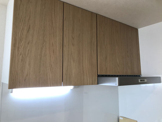 床のフローリング同様、爽やかな明るい色のウッド調のキッチン。
