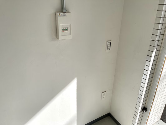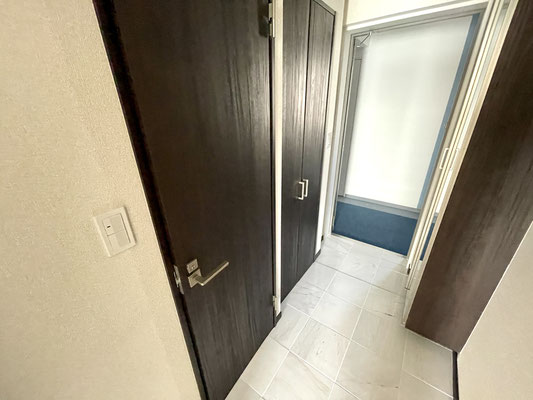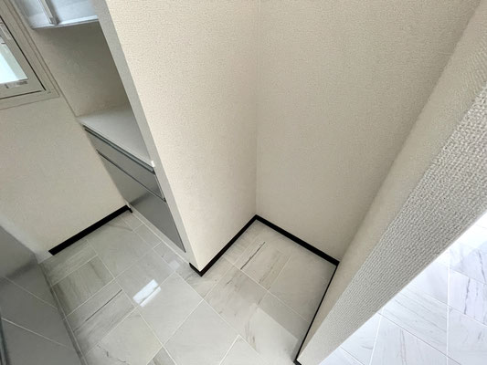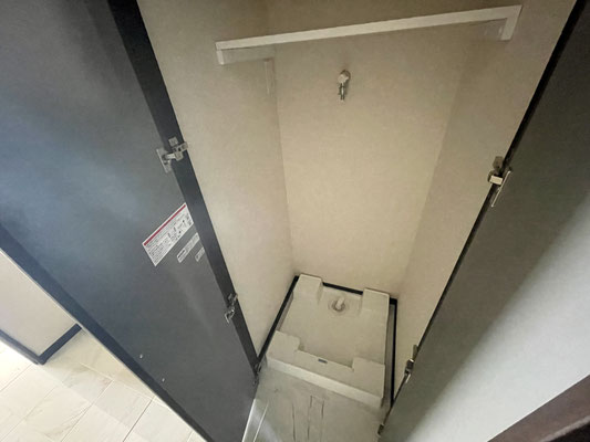右手には扉付きの洗濯機置場〜