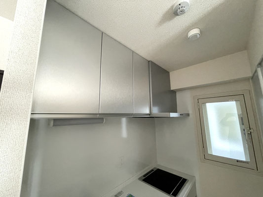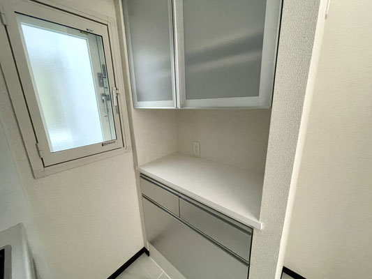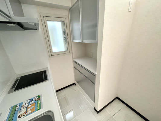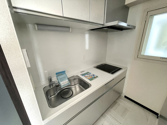 お手入れのしやすいIHコンロや食器棚も付いたキッチンスペースは白とシルバーで統一!!