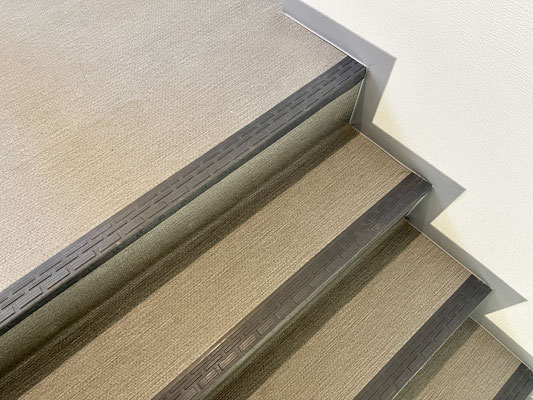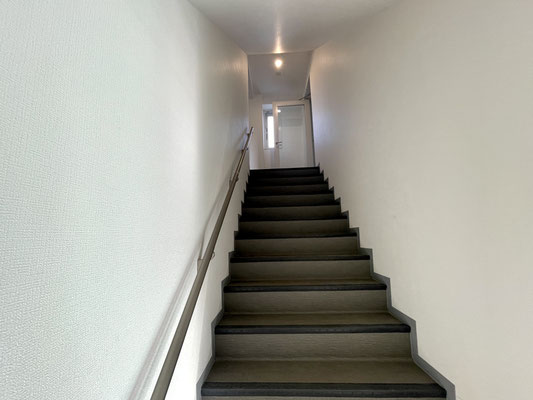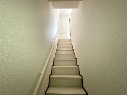 階段は広く、雨の日も滑りにくそうな床材を使用!
