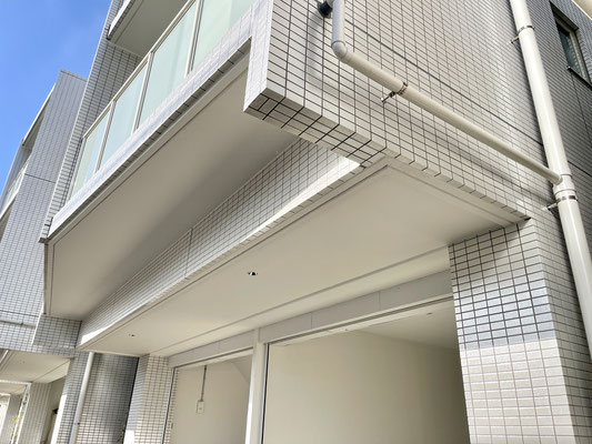 建物外観はモダンなタイル張り低層マンション。オーバーハングを多用し雨の日にも便利な作りです〜