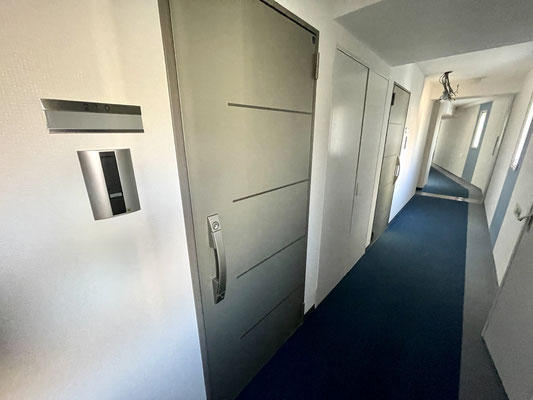 踊り場からは各戸の玄関ドアが並ぶ共用スペース。
