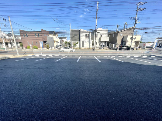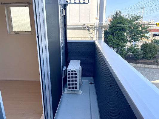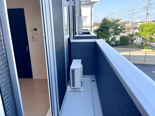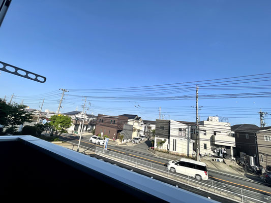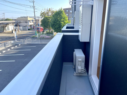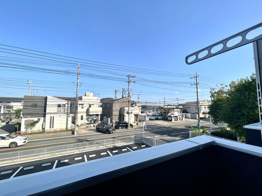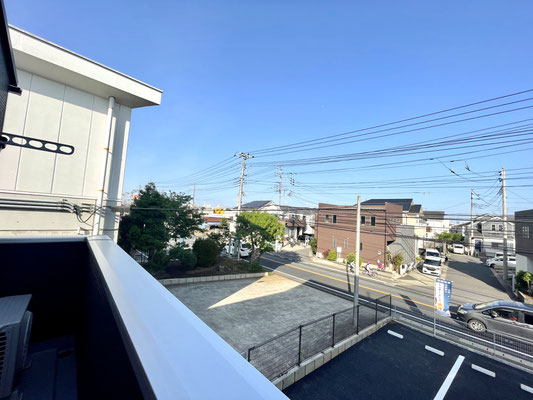 建物の前面が駐車場、道路と抜けているためとても気持ちの良いバルコニーです♪