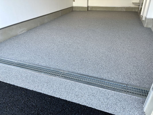ガレージ床は小さな砂利を固めたようなモノを採用。