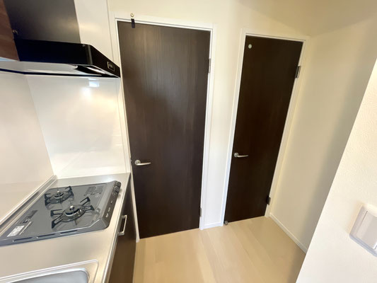 左手のドアは洗面台、洗濯機置場のある脱衣所。